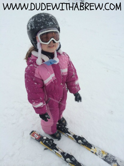 First thing you want to do is have them bundled up pretty good. A one piece snow suit works really well because it doesn’t allow snow to go down their pants. Good winter gloves that allow their fingers to move and grip and a thin hat that will fit under the helmet. Another thing you’ll want to have for them is ski goggles. I’ve gotten her used to wearing goggles by allowing her to use them to play in the snow at home. Without them, kids will be squinting and have a hard time concentrating on what they’re doing. Ski resorts don’t rent goggles, so you’ll have to bring them with you or buy them at the lodge (if they have them). I found hers at a spring clearance sale for pennies on the dollar at a local ski shop.